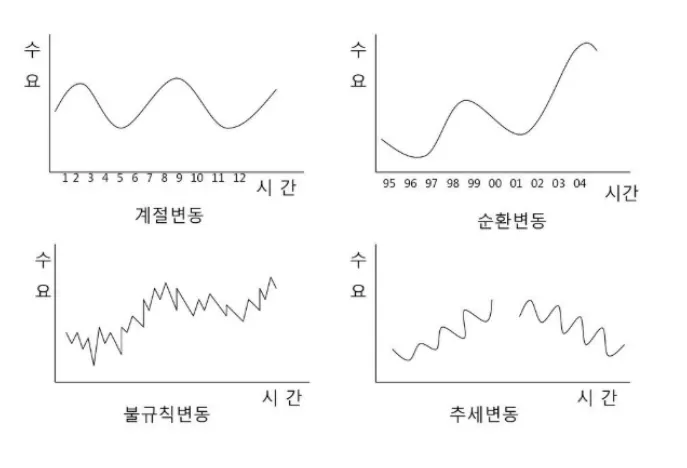 계절성(Seasonality): 일부 시계열 데이터는 특정 시간 주기에 따라 반복되는 패턴을 보일 수 있다. 예를 들어, 매년 특정 시즌에 판매량이 증가하는 소매업의 경우 계절성이 있을 수 있다.