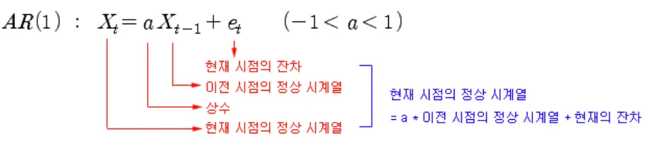 자기 상관성을 반영하여 이전 관측값이 이후에 영향을 미칠것이라는 아이디어에 기반한 모델이다. AR(p)는 t-시점의 관측값을 이전 p-시차 동안의 선형결합으로 나타낸다.