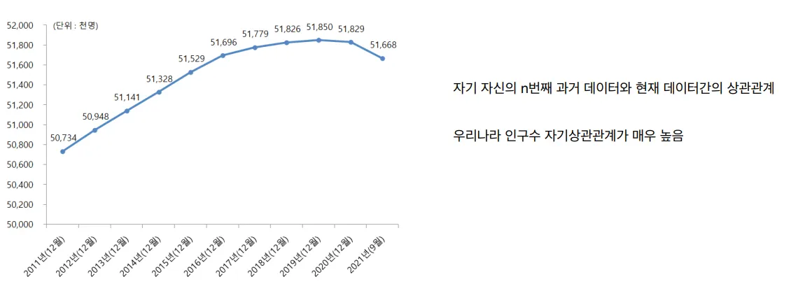 자기 상관관계(Auto Correlation): 시계열 데이터는 시간의 흐름에 따라 서로 상관관계를 가질 수 있으며, 이전의 데이터가 이후 데이터에 영향을 미칠 수 있다.