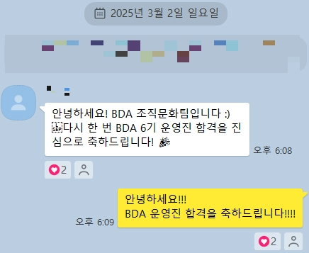안녕하세요. BDA 운영진이 만족할 수 있는 업무 환경을 제공하기 위해 일하는 조직문화팀입니다!