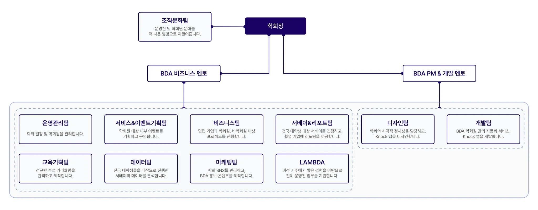 각 팀은 학회 운영의 필수 요소들을 책임지며, 학회원들이 최상의 학습 경험을 누릴 수 있도록 합니다.