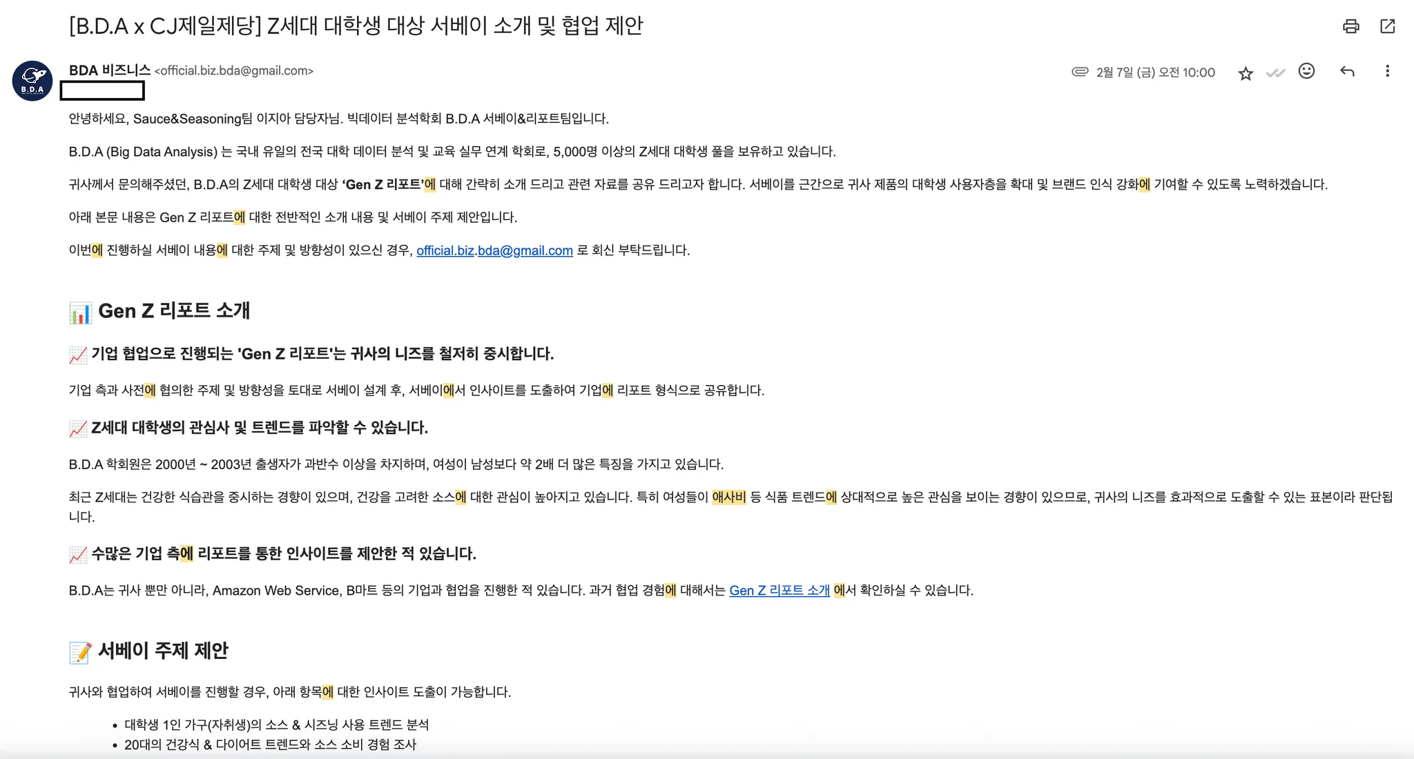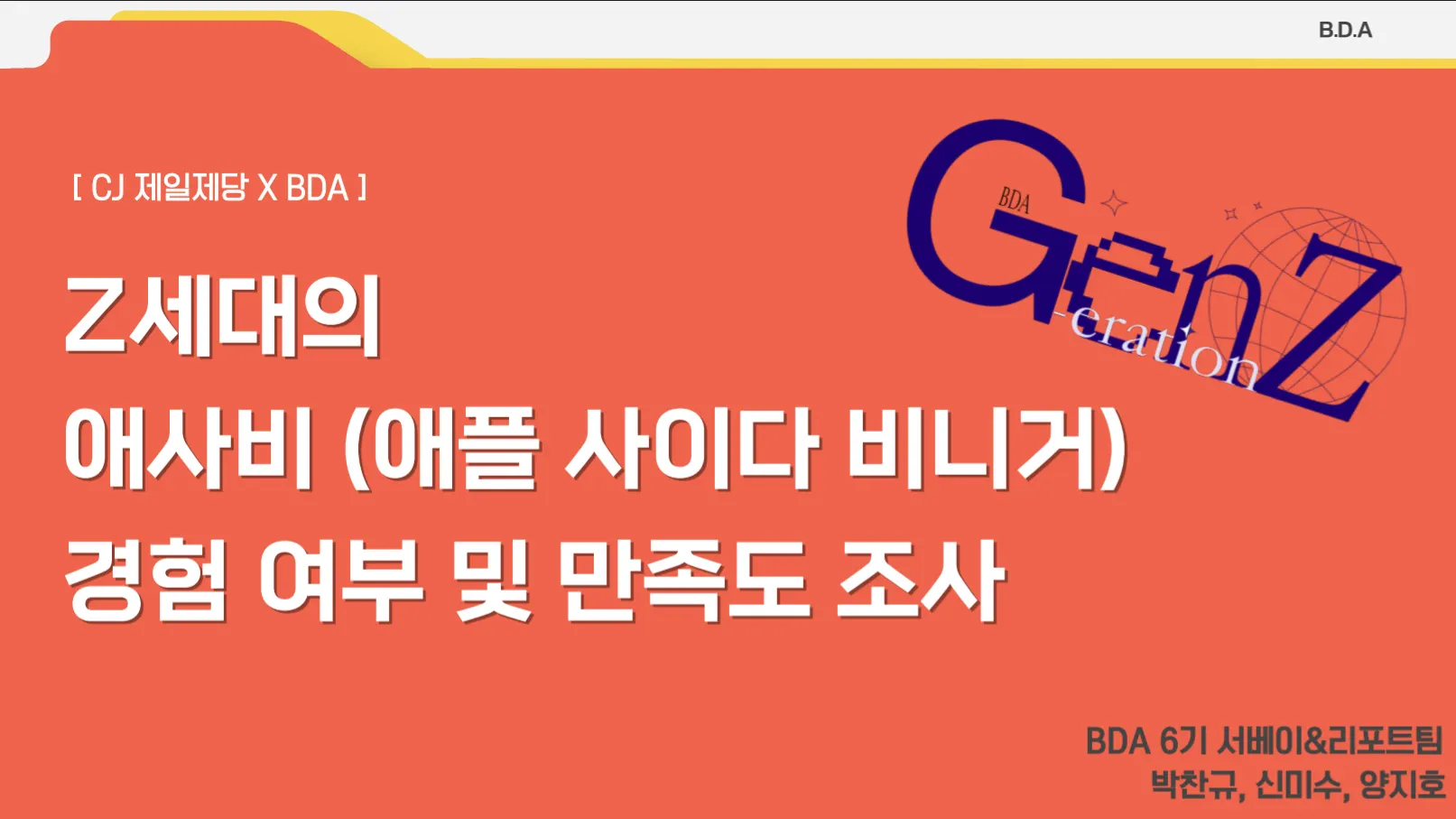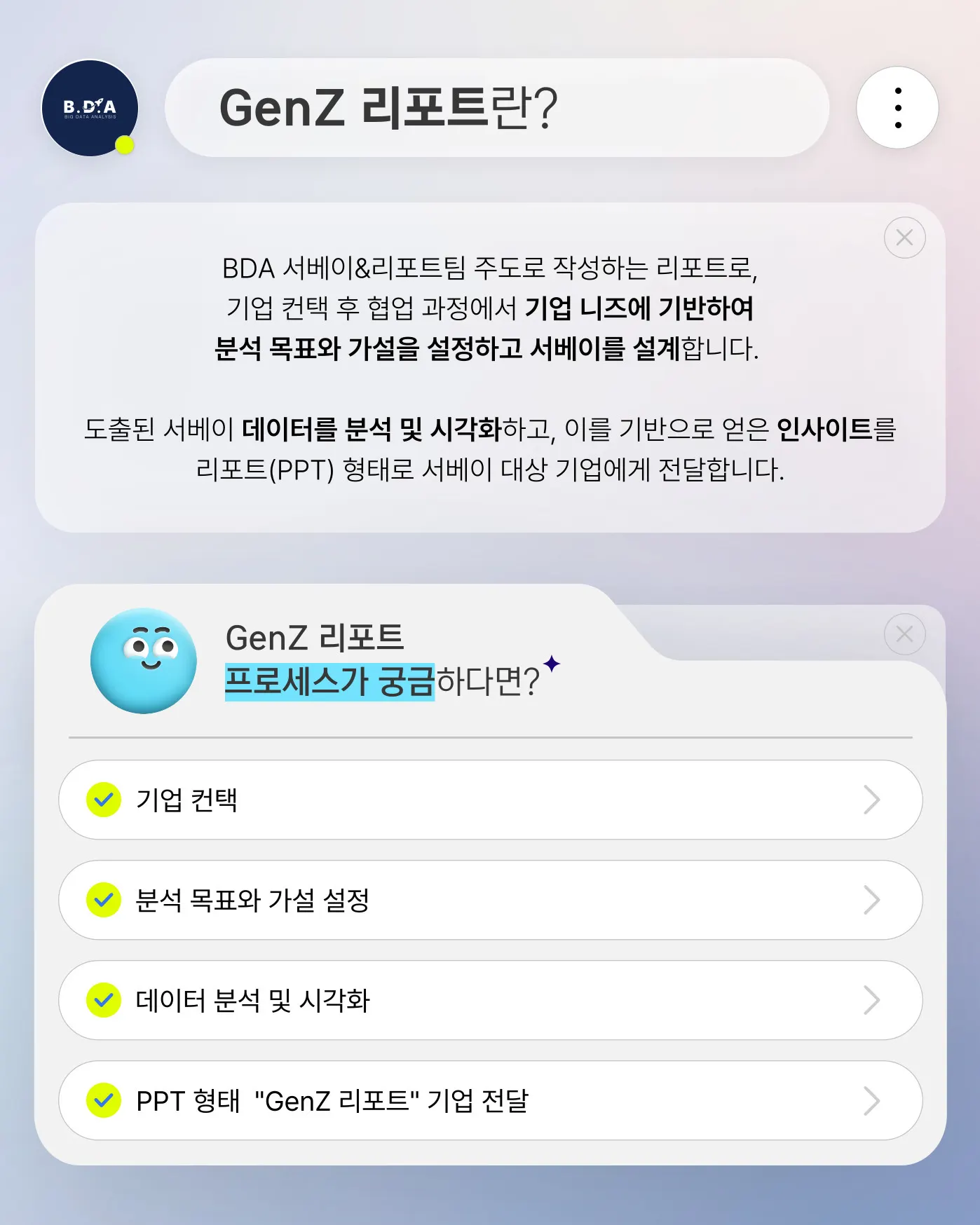 BDA의 분석력과 Z세대 구성원으로서의 감각을 결합해, 기업이 놓치기 쉬운 사회적 맥락과 감성적 통찰을 전달하는 데 의의가 있으며, 실무 중심의 데이터 리포트 경험을 통해 서베이 리포트팀 개인에게도 성장의 기회를 제공합니다.