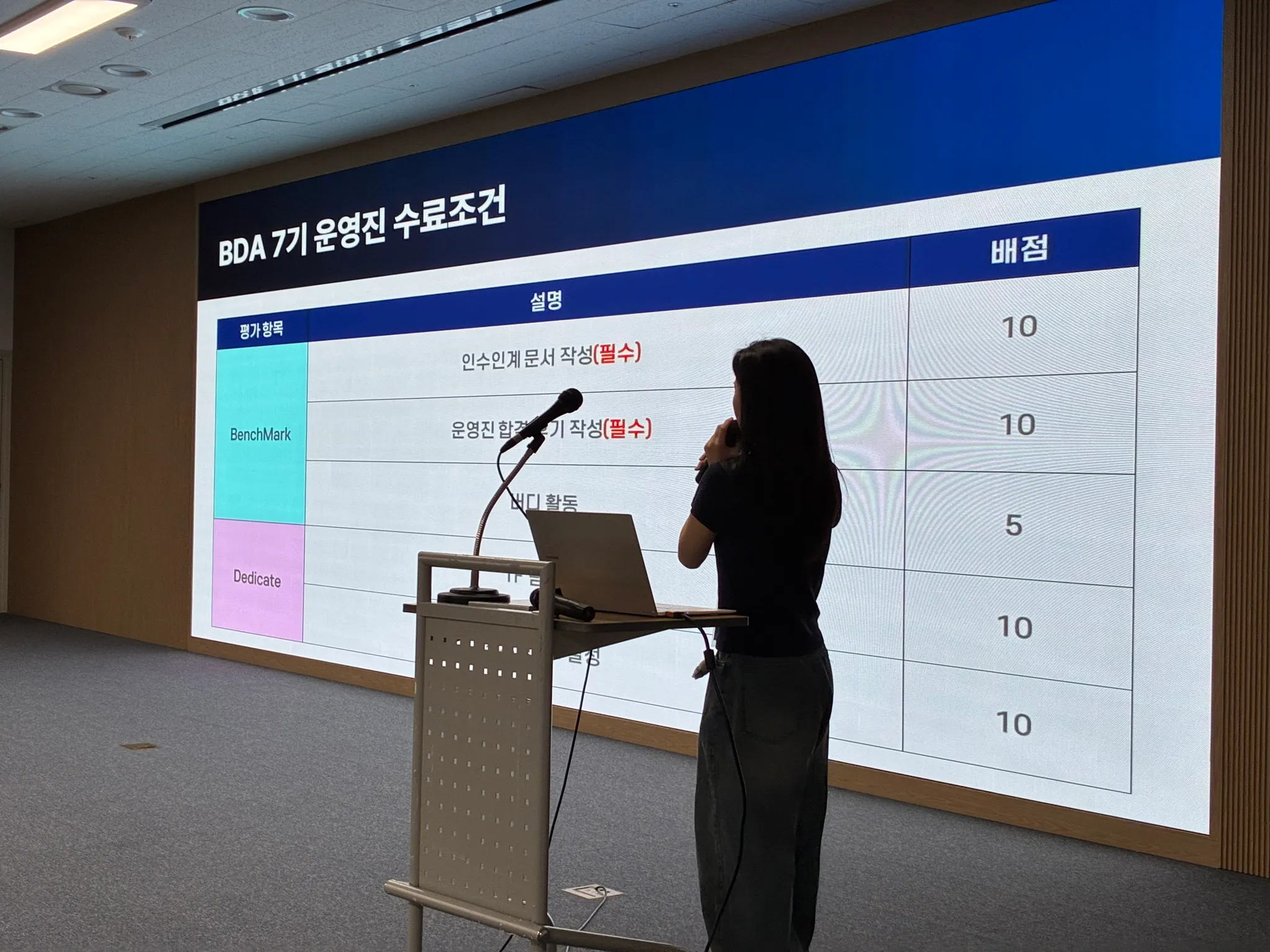 7기 운영진들에게는 앞으로 어떤 식으로 BDA에 기여하고 스스로 성장해 나갈 수 있을지 배울 수 있는 시간이었습니다.