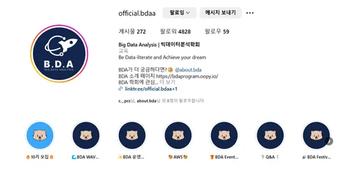 데이터팀은 BDA를 더 나은 학회로 발전시키기 위해 실질적인 데이터 분석 업무를 진행합니다. 학회원 데이터 분석을 통해 인사이트를 도출하고, 학회원들을 위한 데이터 분석 콘텐츠를 주기적으로 발행하고 있습니다. 뿐만 아니라, 데이터 분석 학회의 데이터 팀으로써 BDA를 대표해서 실무 프로젝트와 공모전 등을 참가하며 BDA의 위상을 높이기 위해 노력하고 있습니다.
