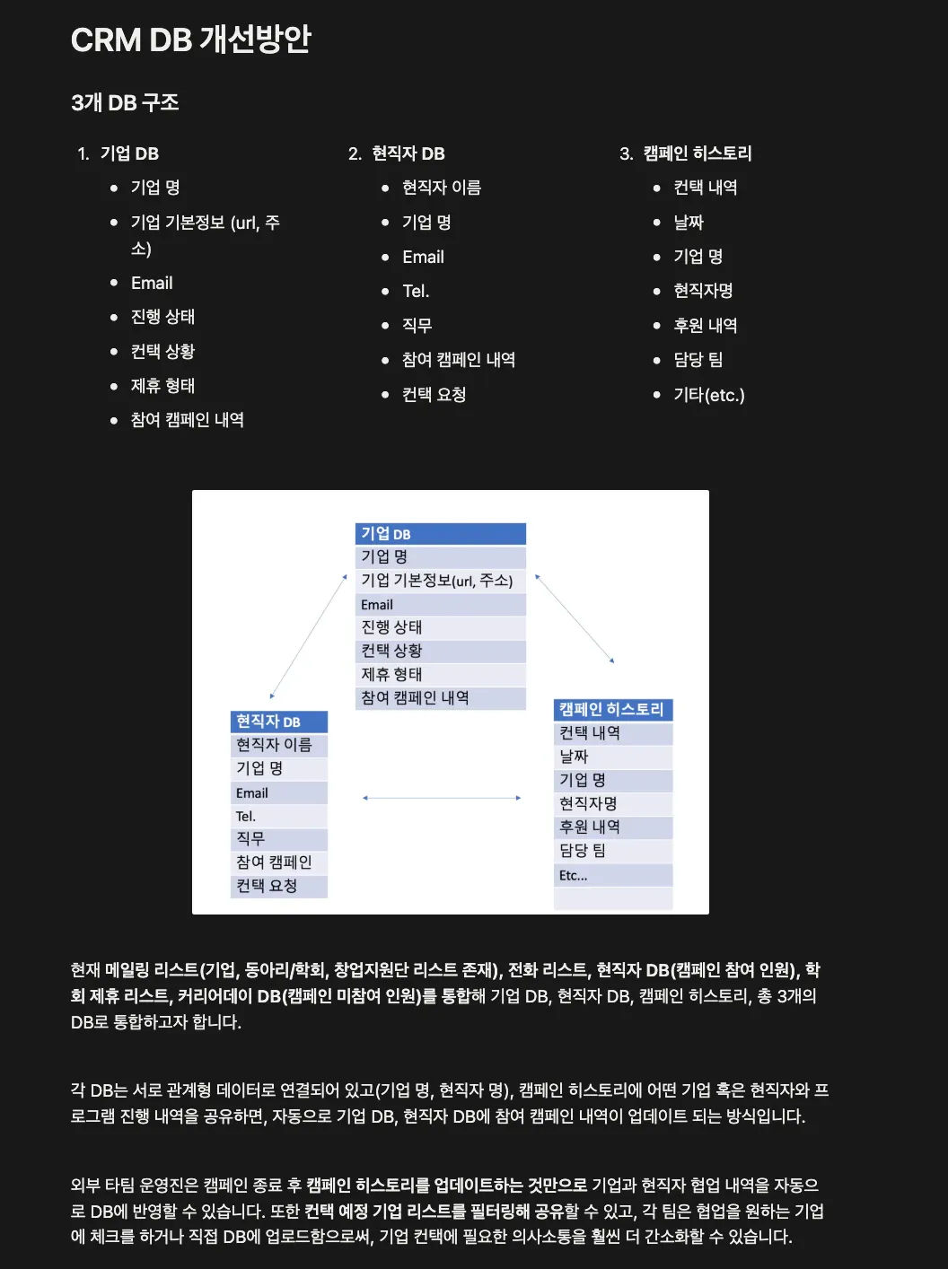 BDA의 CRM DB구조를 기반으로, 해당사항이 있는 단체들의 풀을 리스트업하고, 컨택합니다.