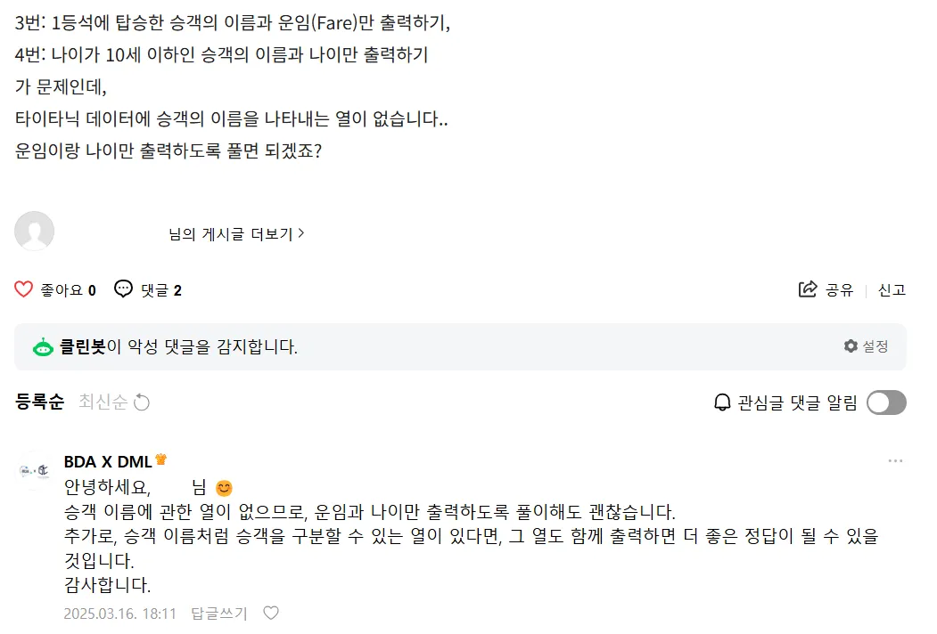 데이터팀은 학회원 분반 Q&A 게시판을 담당하여 게시판에 올라오는 질문 사항을 신속하게 파악하고 적절한 답변을 제공하는 역할을 수행합니다.