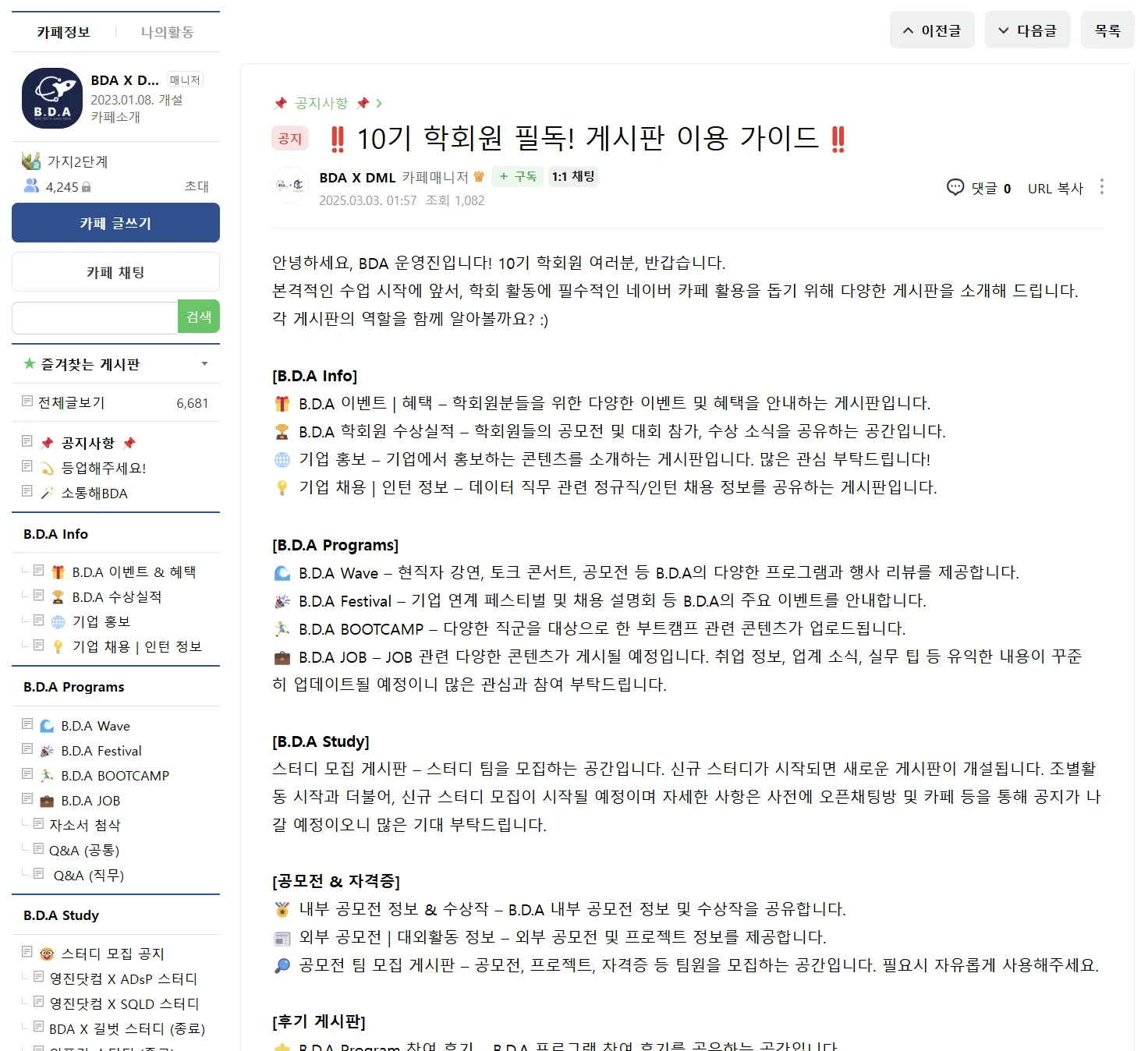 네이버 카페 학회원 게시판 이용 가이드 페이지