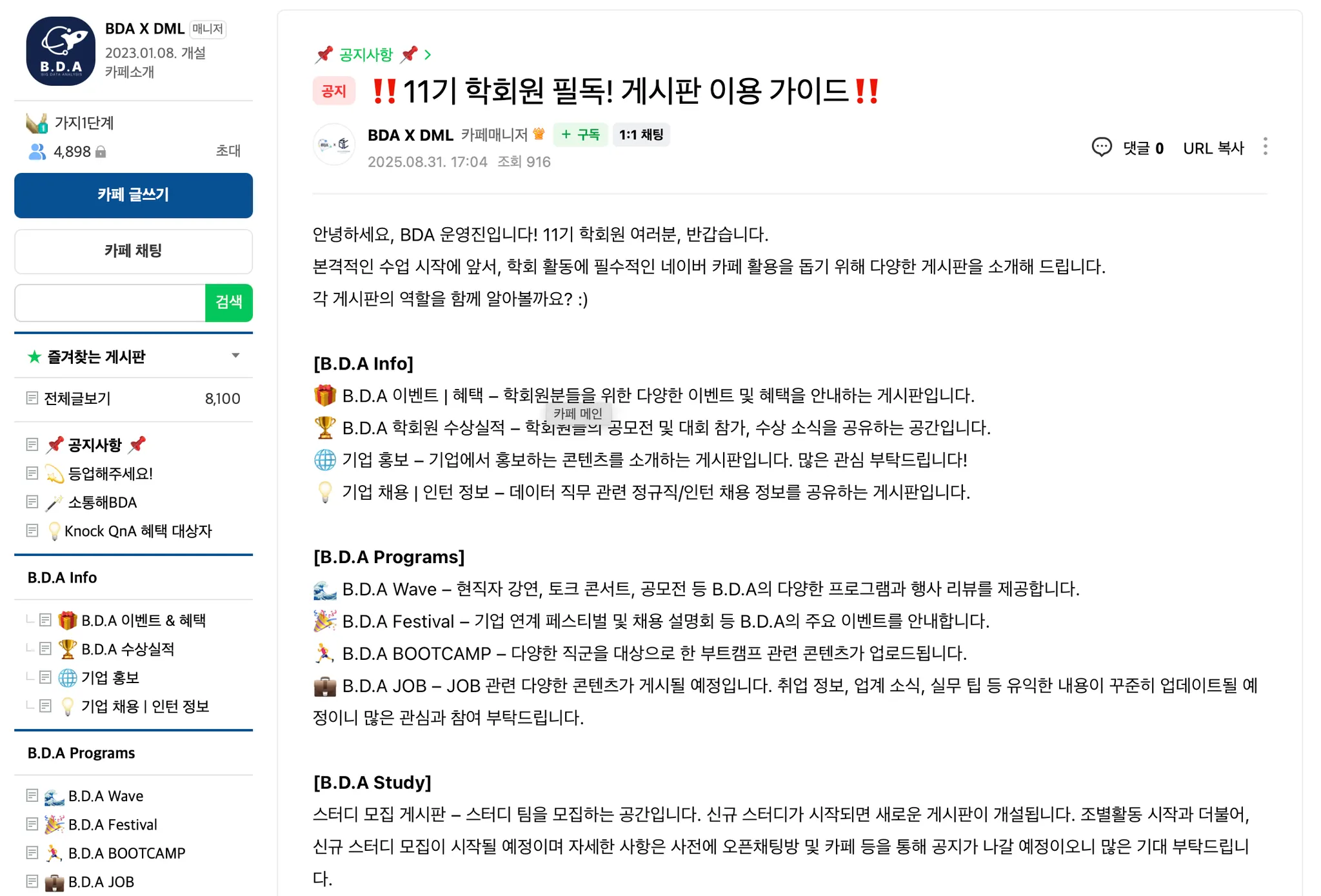 네이버 카페 학회원 게시판 이용 가이드 페이지