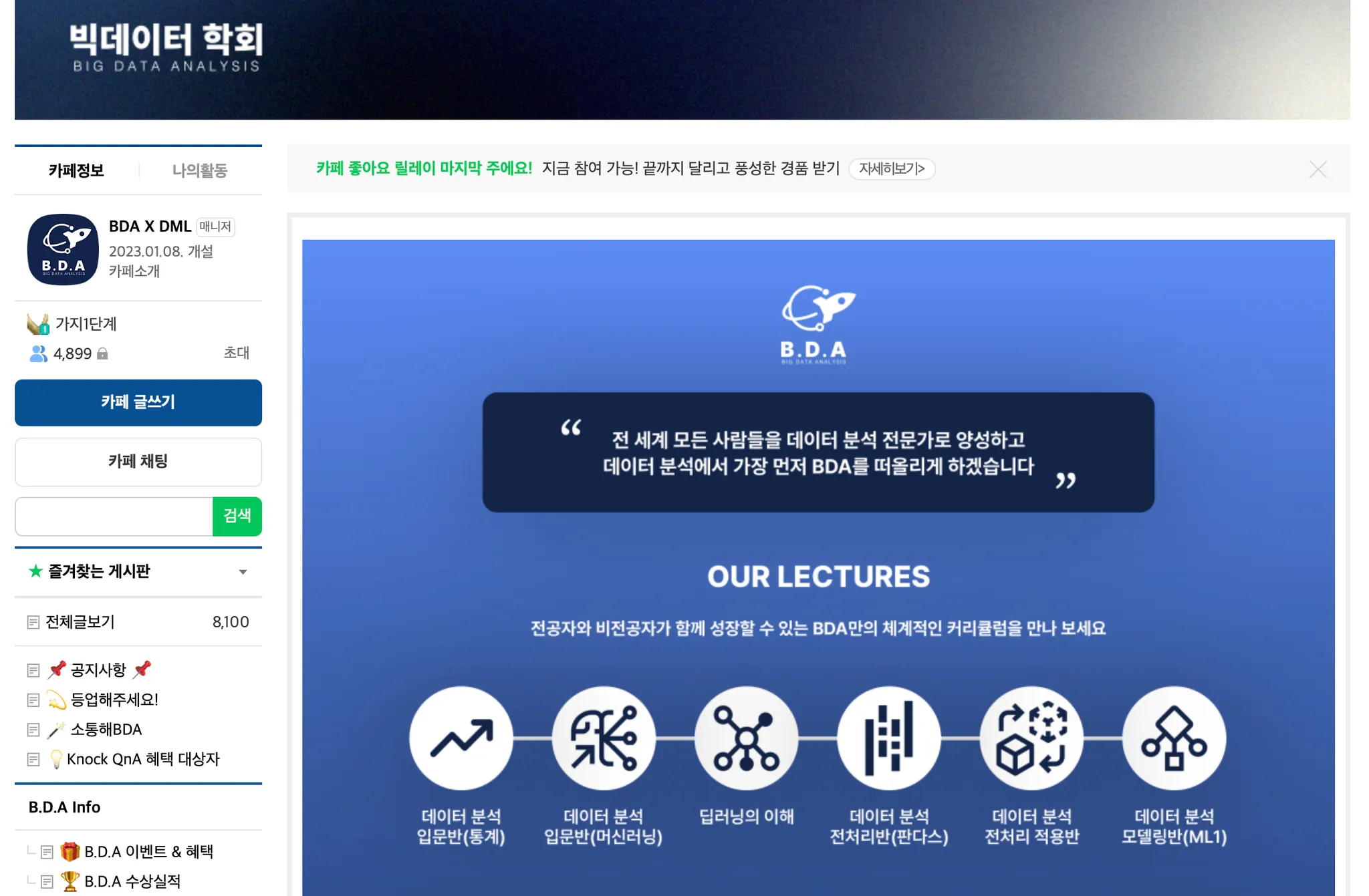 학회원은 카페를 통해 정규반 과제 QnA 게시판 이용, 조별활동 진행, 각종 스터디 및 공모전 정보 확인이 가능합니다.