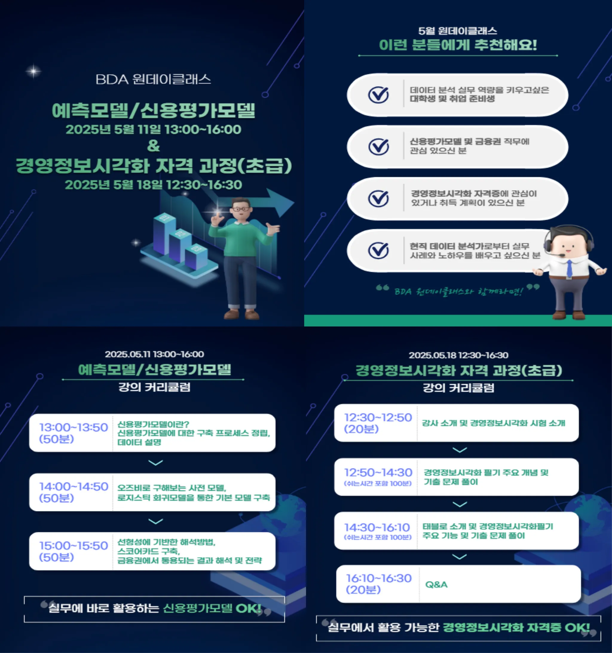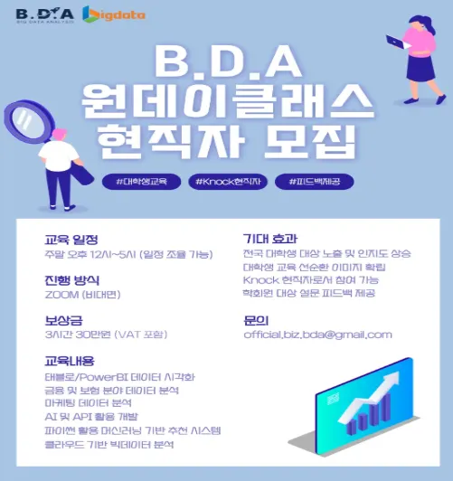 BDA 원데이 클래스는 현직 데이터 분석가, 데이터 사이언티스트, AI 개발자 등 실무 전문가를 초청해 데이터 분석 관련 강연을 진행하는 프로그램입니다.