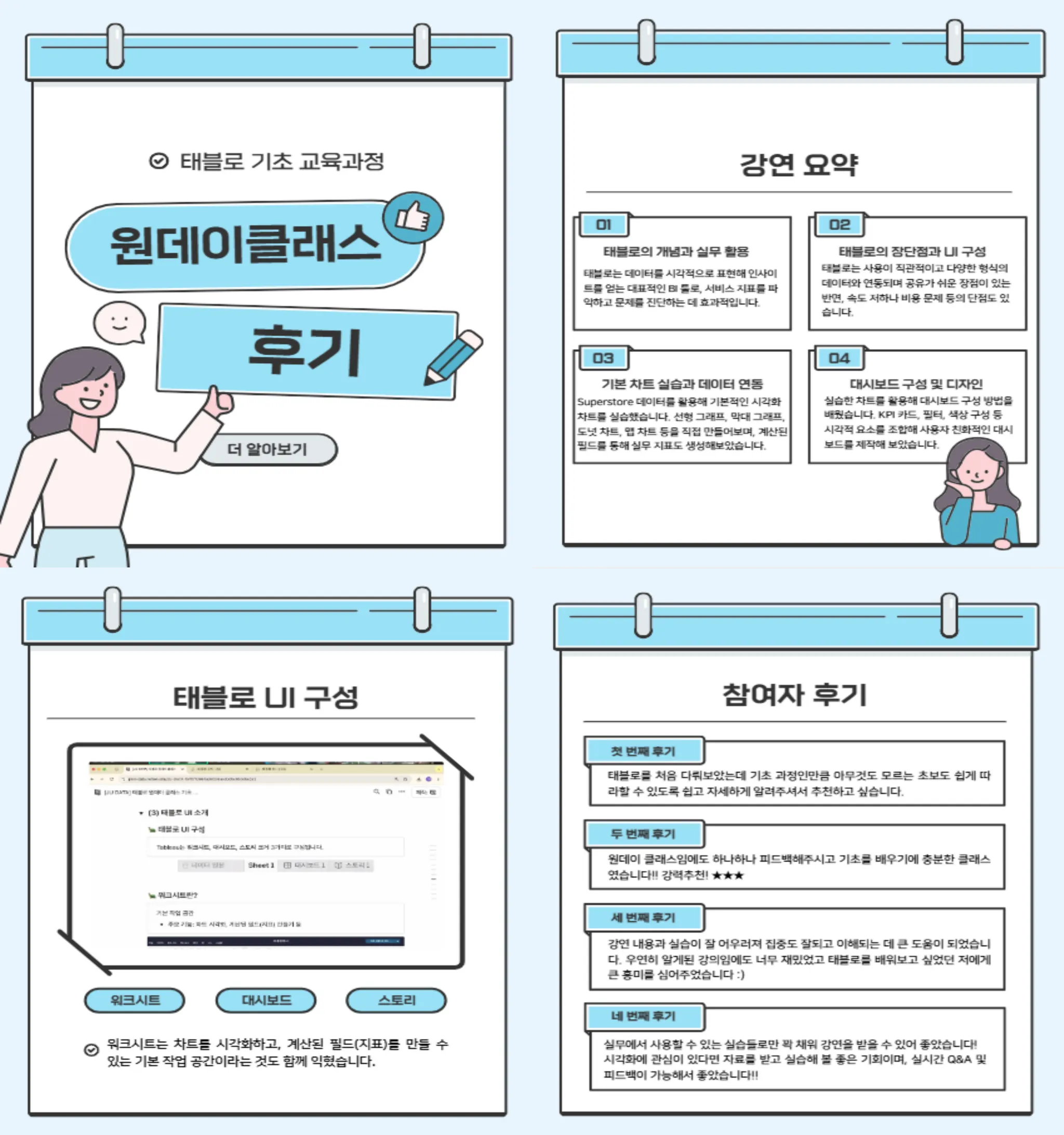 원데이 클래스 종료 후에는 만족도 조사를 실시하고 후기 카드뉴스를 제작합니다.