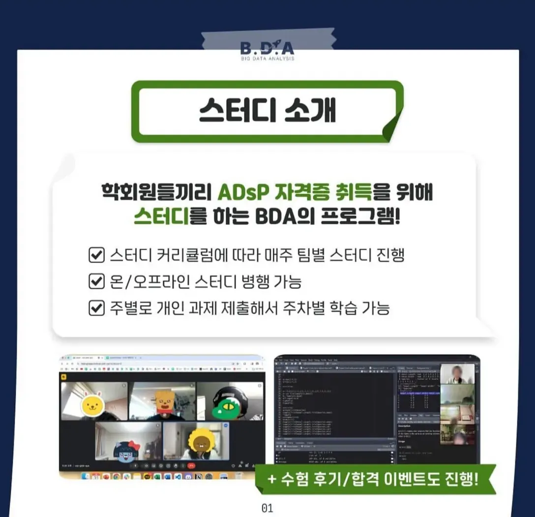 BDA STUDY는 학회원들의 성장을 위해 다양한 기업과 협업하여 운영되는 스터디 프로그램입니다.