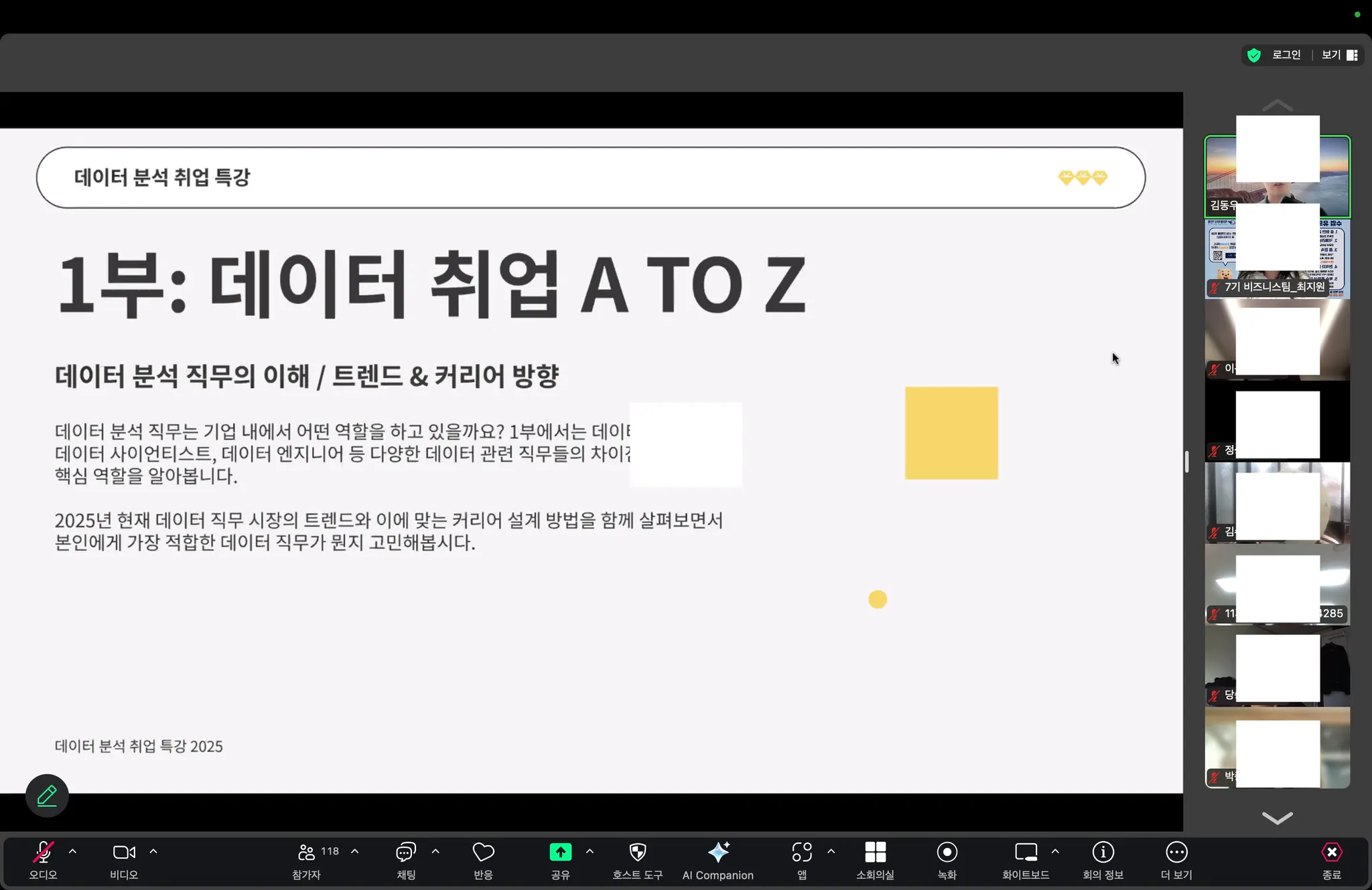 이에 “데이터 취업 A to Z - 모두의 로드맵”을 주제로 선정하여, 향후 7기의 강연이 점진적으로 더욱 구체화되고 체계적으로 확장될 수 있도록 구성·진행하였습니다.