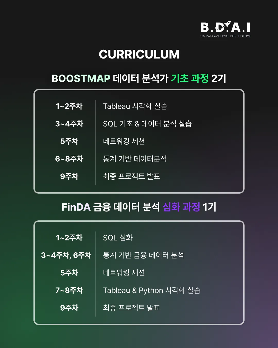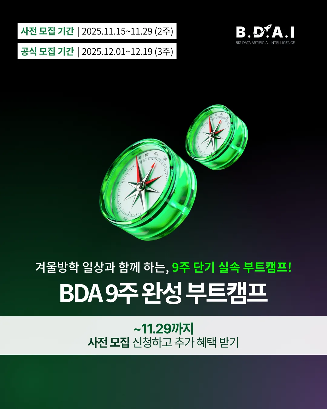 BDA 부트캠프는 실무 중심의 교육과 현직자 네트워킹 기회를 제공하는 9주 단기 집중 교육 프로그램입니다.