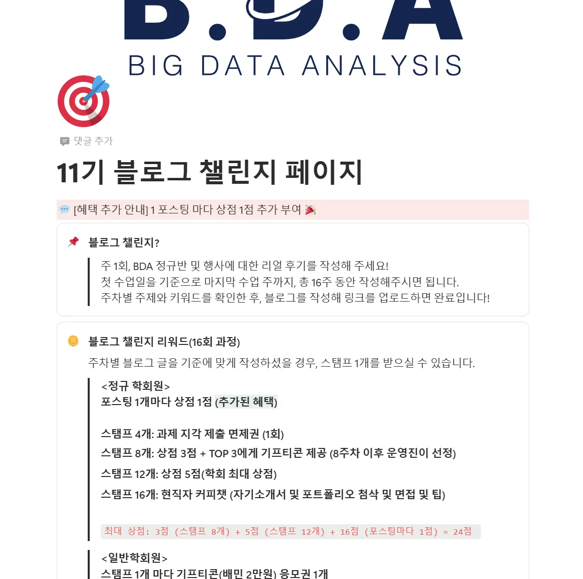 운영관리팀은 정규반 강의 및 BDA의 다양한 활동을 홍보하기 위해 블로그 챌린지를 운영하고 있습니다.