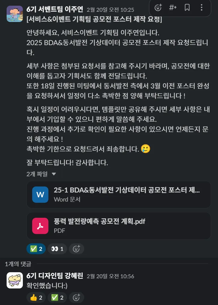 디자인 요청안 수락 및 전달은 모두 슬랙 #디자인-요청 채널에서 이루어졌으며, 아래와 같은 과정으로 진행했습니다.