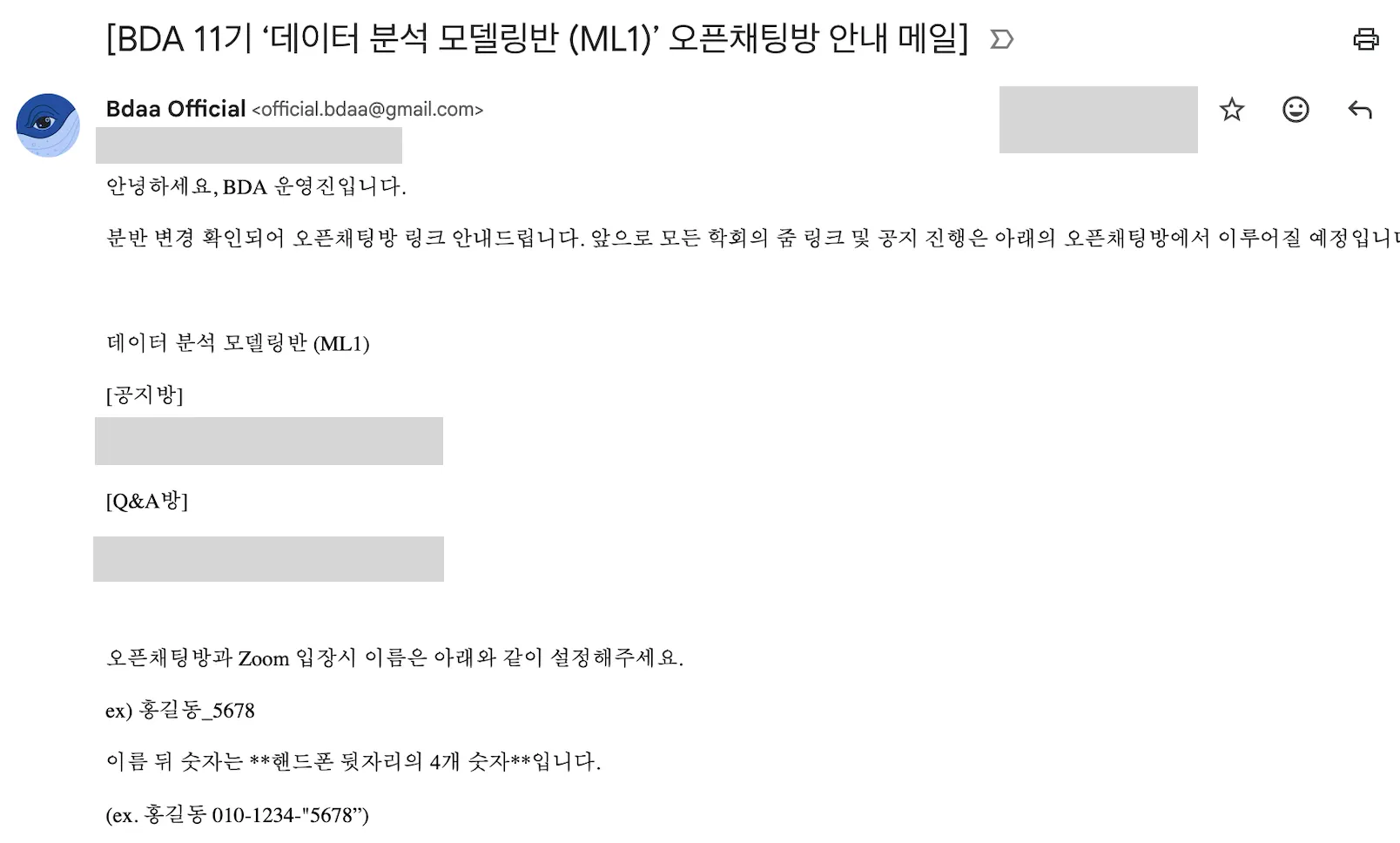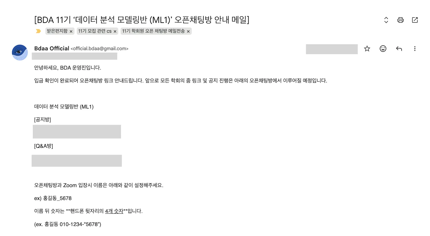 운영관리팀은 실제 모집 기간에 입금 완료 된 신청자를 수합하고 메일을 통해 오픈 채팅방 링크와 노션 페이지를 안내하는 업무를 수행합니다.