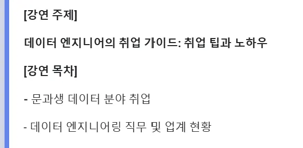 이후 선정된 주제에 대하여 전문성과 현장 경험을 갖춘 현직자 모집이 진행됩니다. 현직자는 학회원들에게 이론을 넘어 실무적인 관점과 경험을 공유할 수 있어야 하므로 주제 선정만큼이나 중요한 단계입니다. 이와 함께 장소 대관, 참여자 확정 및 명단 관리 등의 오프라 강연 현장 준비 업무가 진행됩니다.