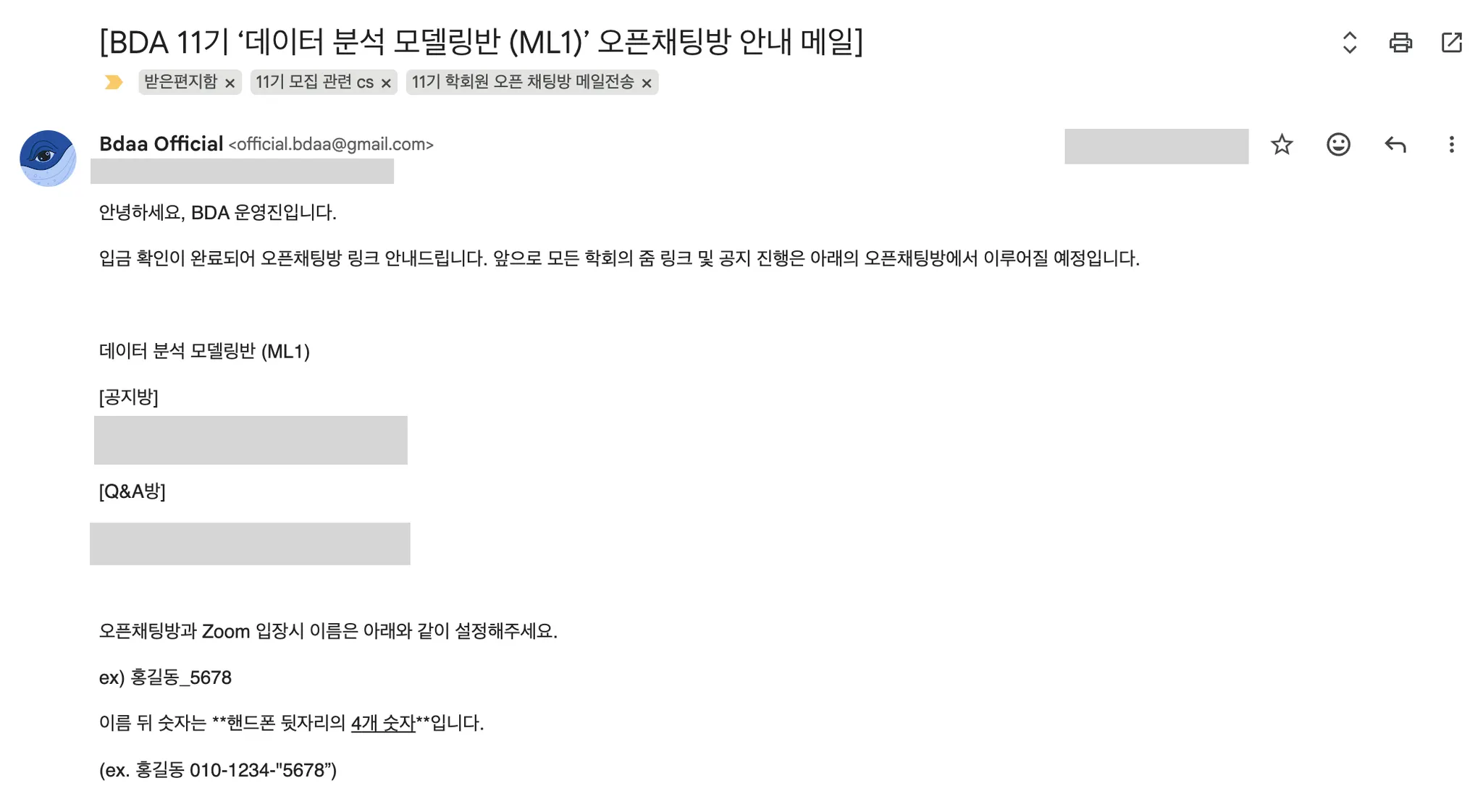 학회원에게 단체 메일을 발송하는 것 역시 운영관리팀의 업무입니다. 학회원 모집 과정에서 오픈채팅방 혹은 노션페이지를 안내하는 경우, 수료 과정에서 수료증을 송부하는 경우가 이에 해당됩니다.