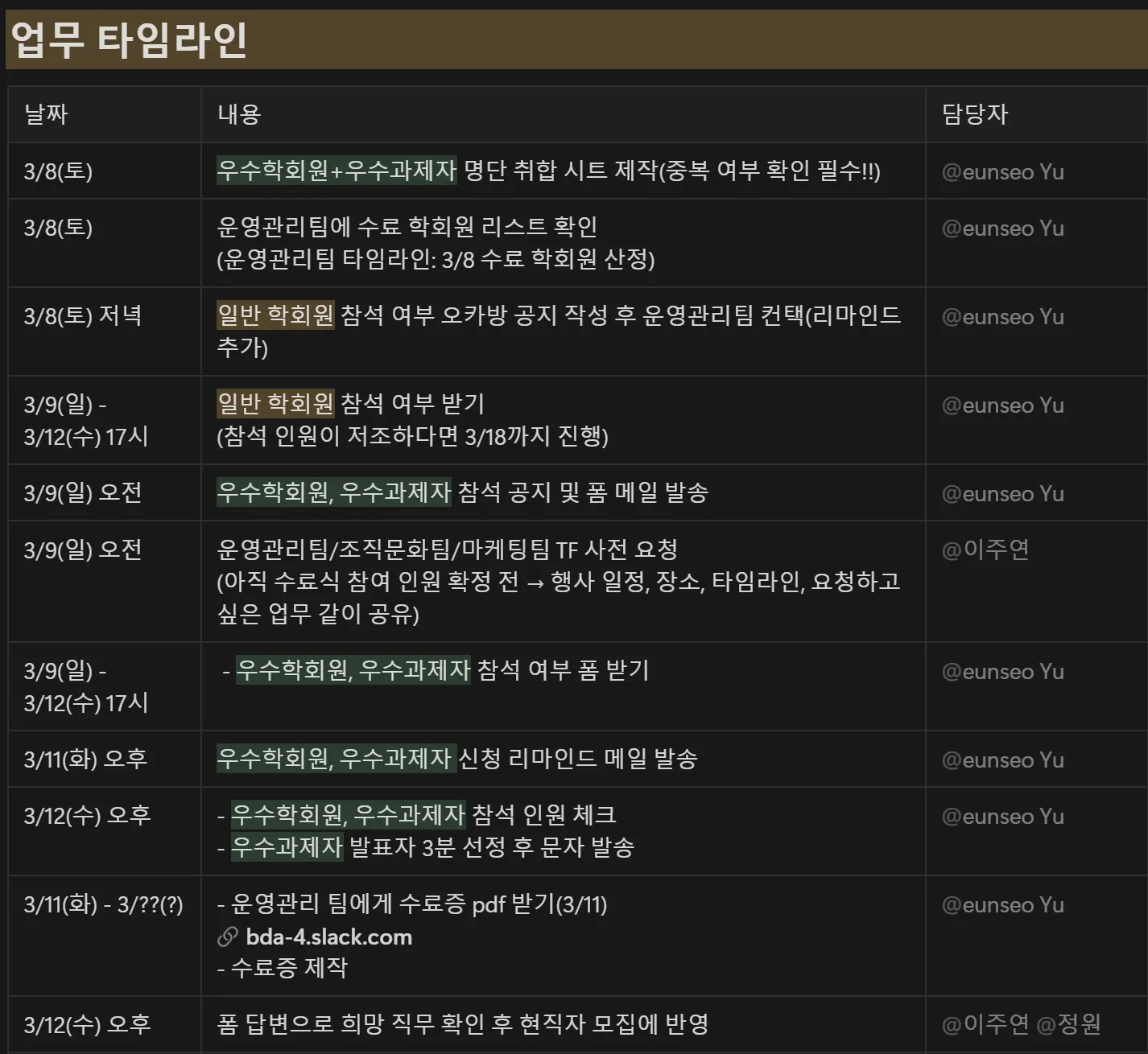 내부/외부 기획안 작성, 장소 대관, 우수 학회원 및 과제자 관리, 현직자 네트워킹 운영까지 담당하게 됩니다.
