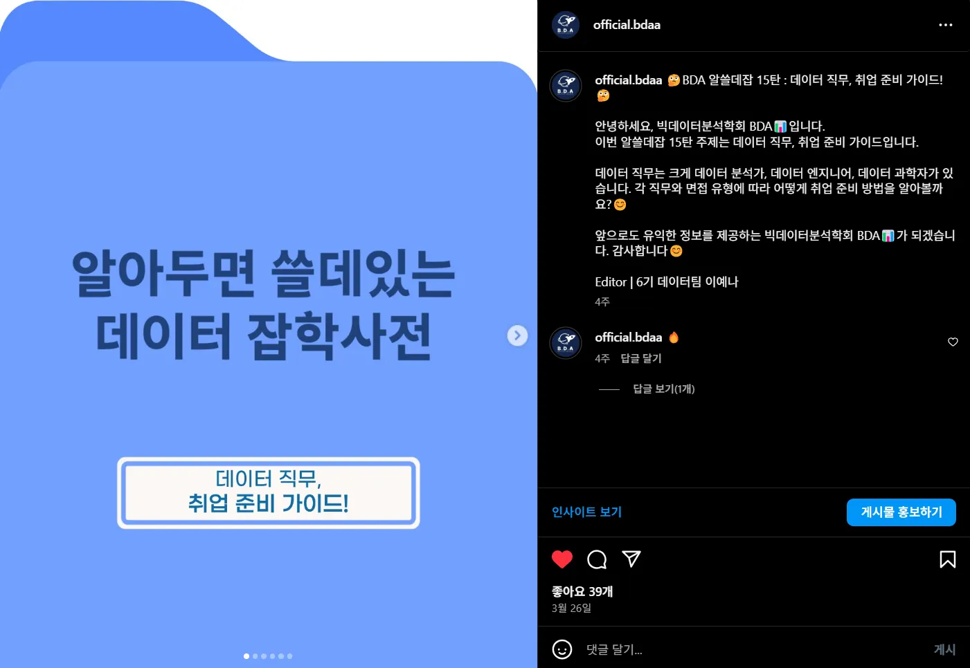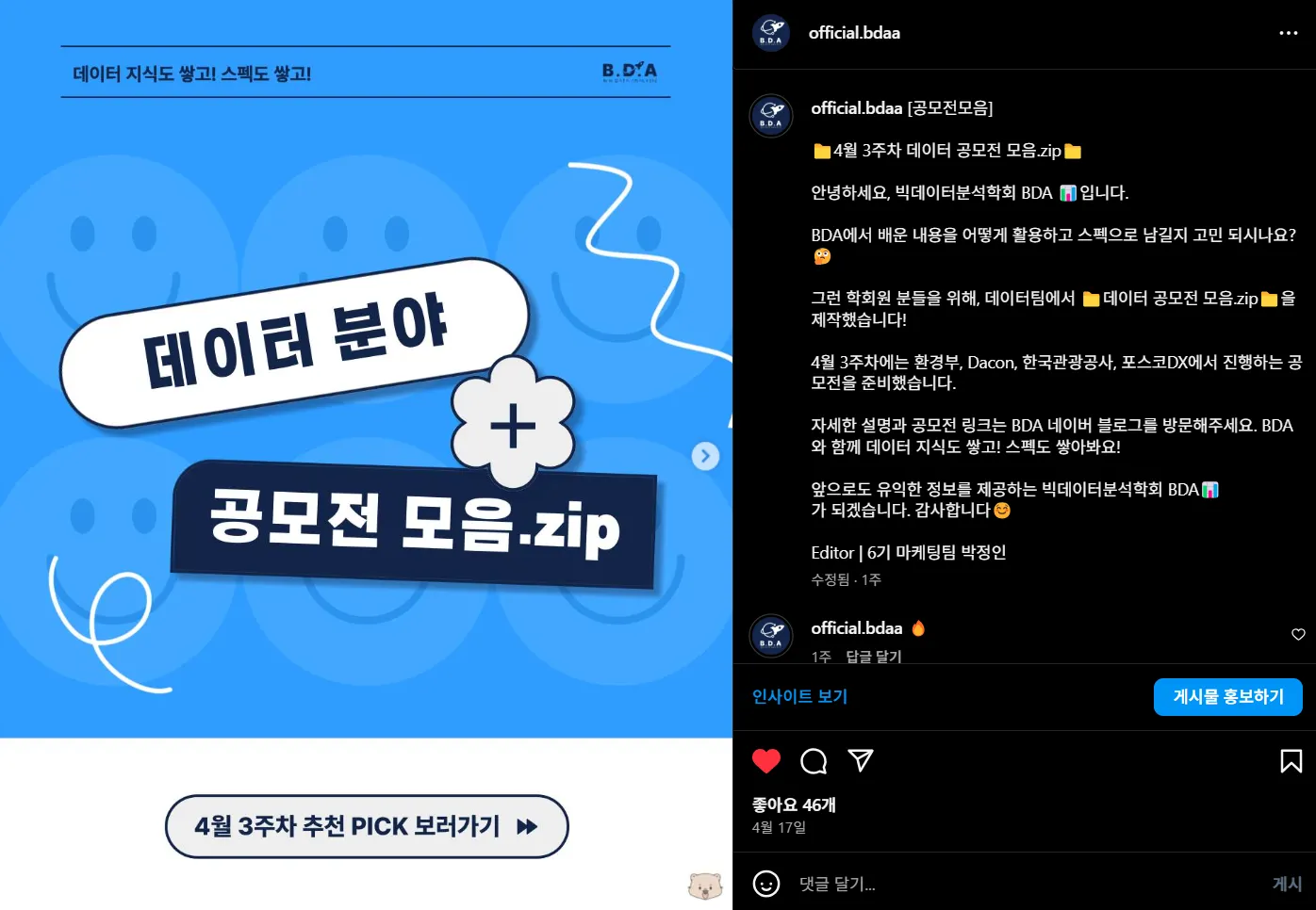 이를 기반으로 마케팅팀은 카드뉴스를 제작하여 학회 인스타그램 채널을 통해 배포합니다.