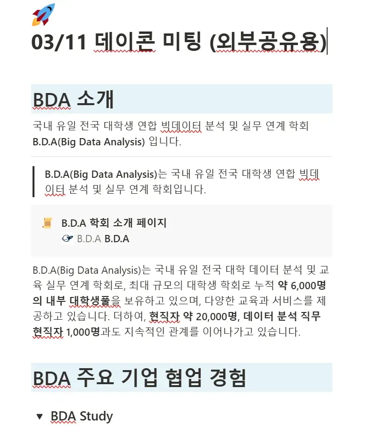 미팅 자료는 BDA를 소개하는 문구와 BDA만의 고유 프로그램, 그간의 기업 및 외부 기관과의 협업 경험 등을 담은 내용과 더불어 미팅 기관과의 협력 내용을 아이템화하여 첨부해주면 더 좋습니다.