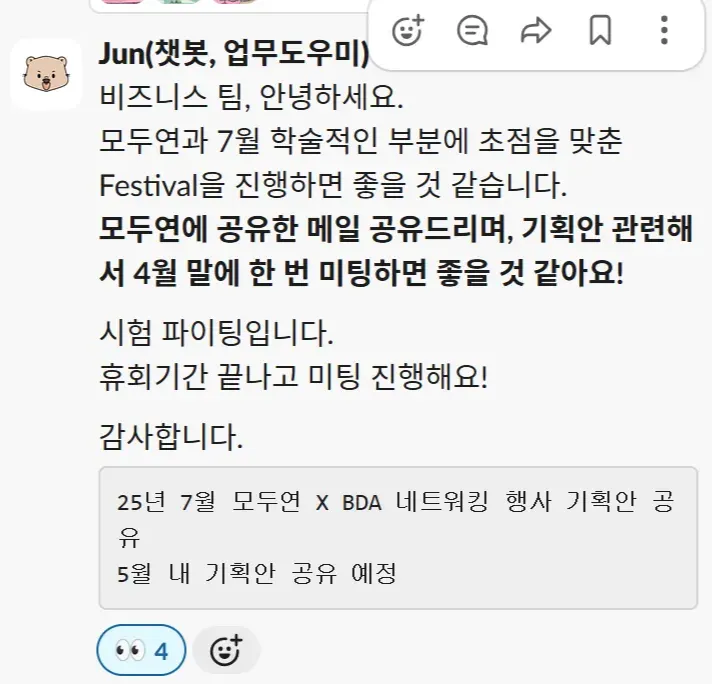 이렇게 학회장님께서 먼저 미팅을 잡고 참여 요청을 해주시기도 한답니다