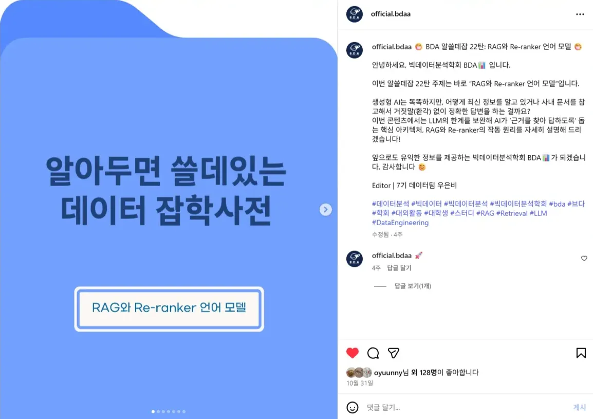 이를 기반으로 마케팅팀은 카드뉴스를 제작하여 학회 인스타그램 채널을 통해 매달 셋째 주 목요일 19시에 배포합니다.