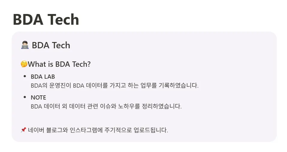 BDA Tech 섹션은 데이터팀의 판단에 따라 자유롭게 기획 및 업데이트될 수 있습니다.