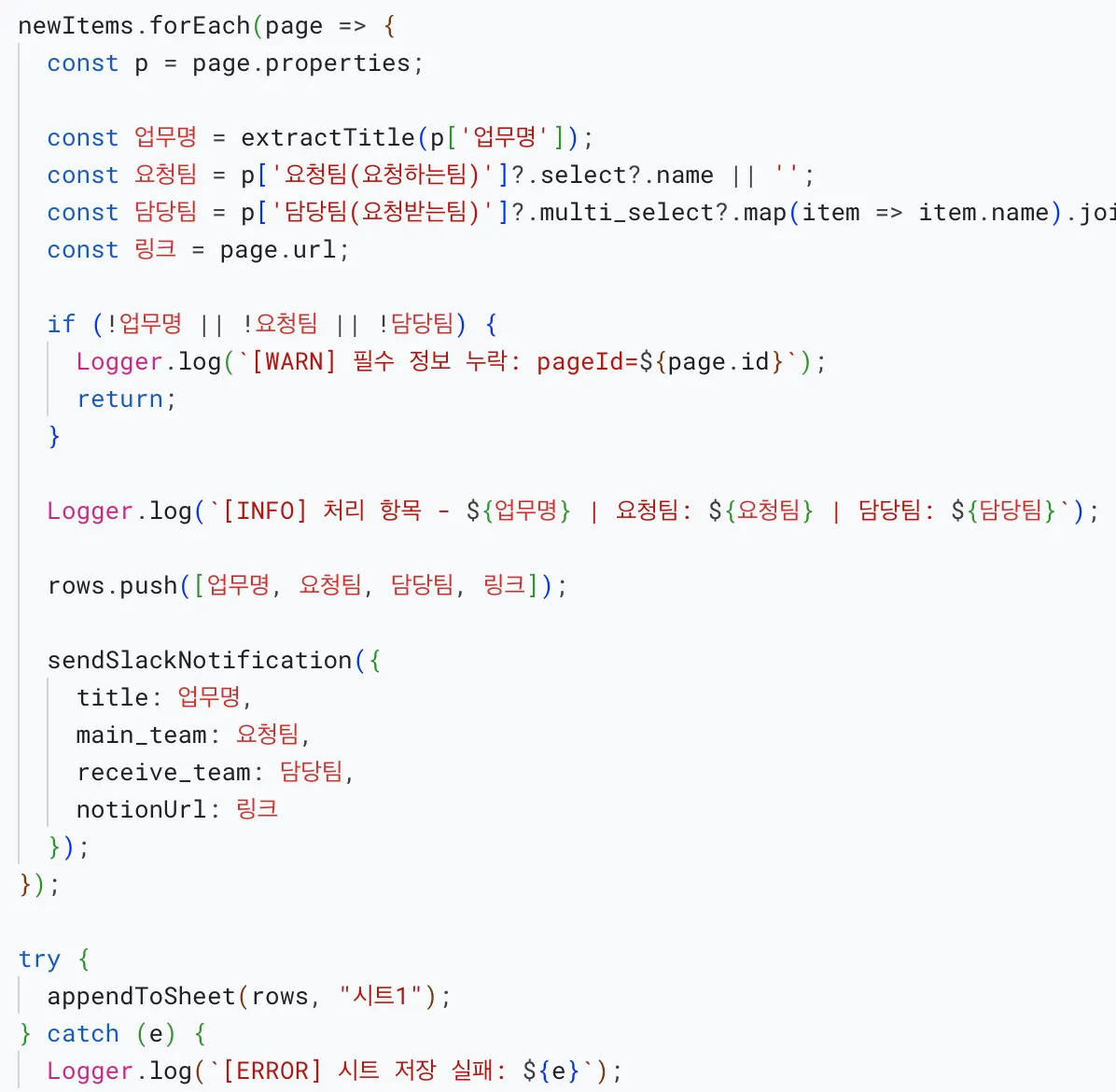 그래서! 개발팀은 노션에 아이템만 등록하면, 자동으로 요청받는 팀의 슬랙 채널에 알림이 가도록 시스템을 구축했습니다.