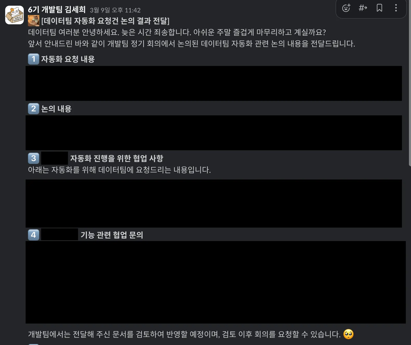 이번 6기 개발팀은 팀 간 협업 과정에서 발생하는 번거로운 공지 절차를 개선하고자, ‘협업 DB 알림 자동화’ 시스템을 만들었습니다.