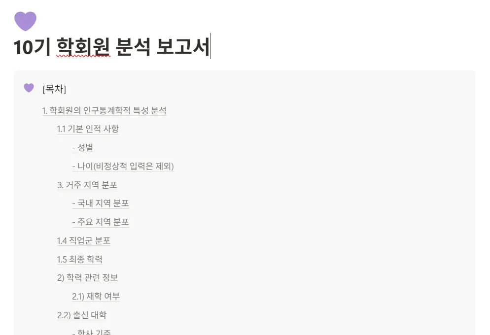 데이터팀은 취합된 모집폼 데이터를 전처리하여 다각적인 측면에서 심층적인 분석을 수행합니다. 도출된 주요 인사이트를 학회 운영 및 관련 부서에 제공함으로써, 향후 학회 운영 전략 수립 및 학회원 관리 방안 개선에 기여합니다.