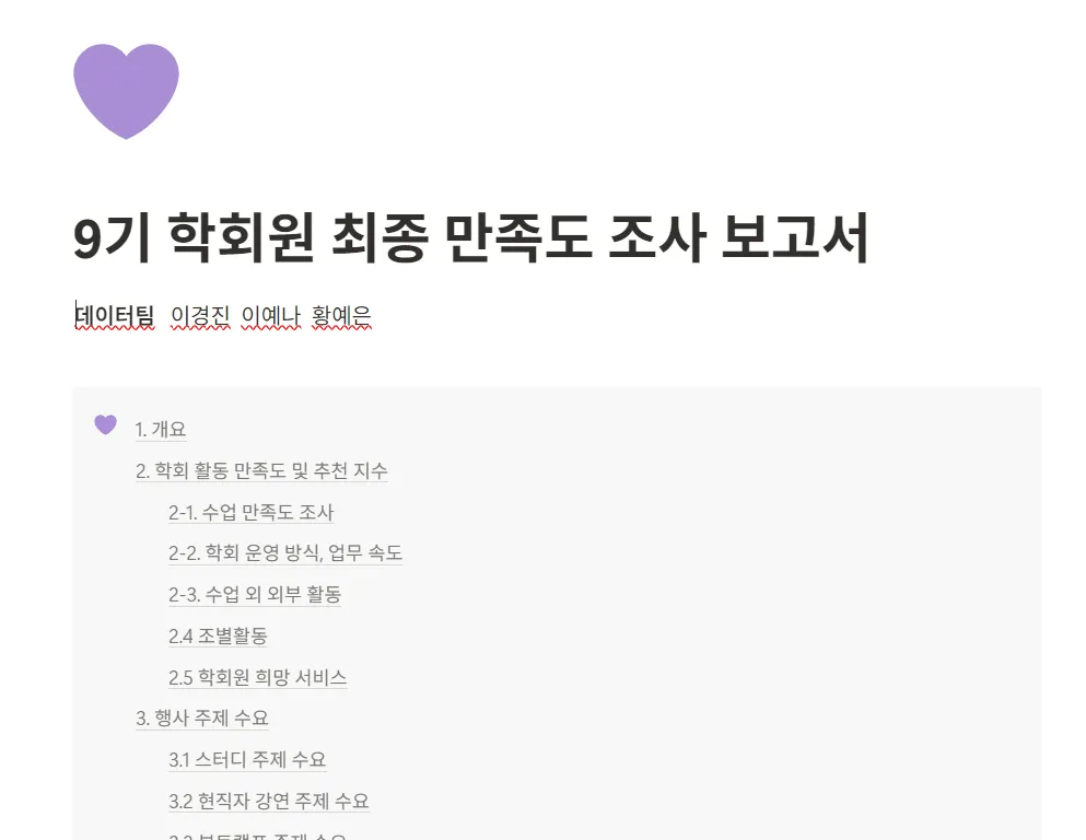 데이터팀은 학회원 만족도 조사 결과를 수집하여 심층적으로 분석하고, 분석 내용을 담은 보고서를 작성하여 운영진 전체에 공유합니다. 더불어, 관련 부서에는 분석 결과에서 도출된 의미 있는 인사이트를 제공하여 학회 운영 개선에 기여합니다.