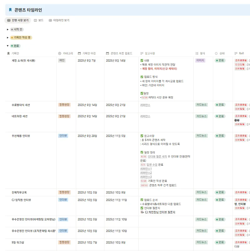 다수의 팀과 협력하여 콘텐츠를 제작 및 운영하는 과정의 체계적인 관리를 위해 리크루트 계정 전용 노션 페이지를 구축했습니다.