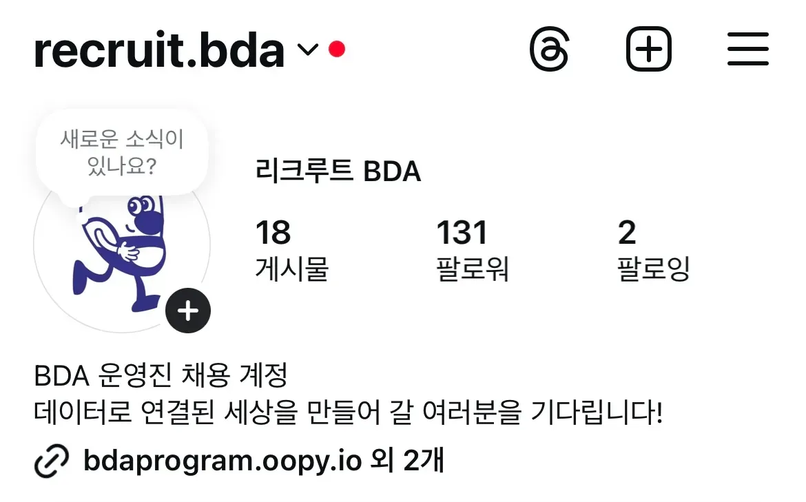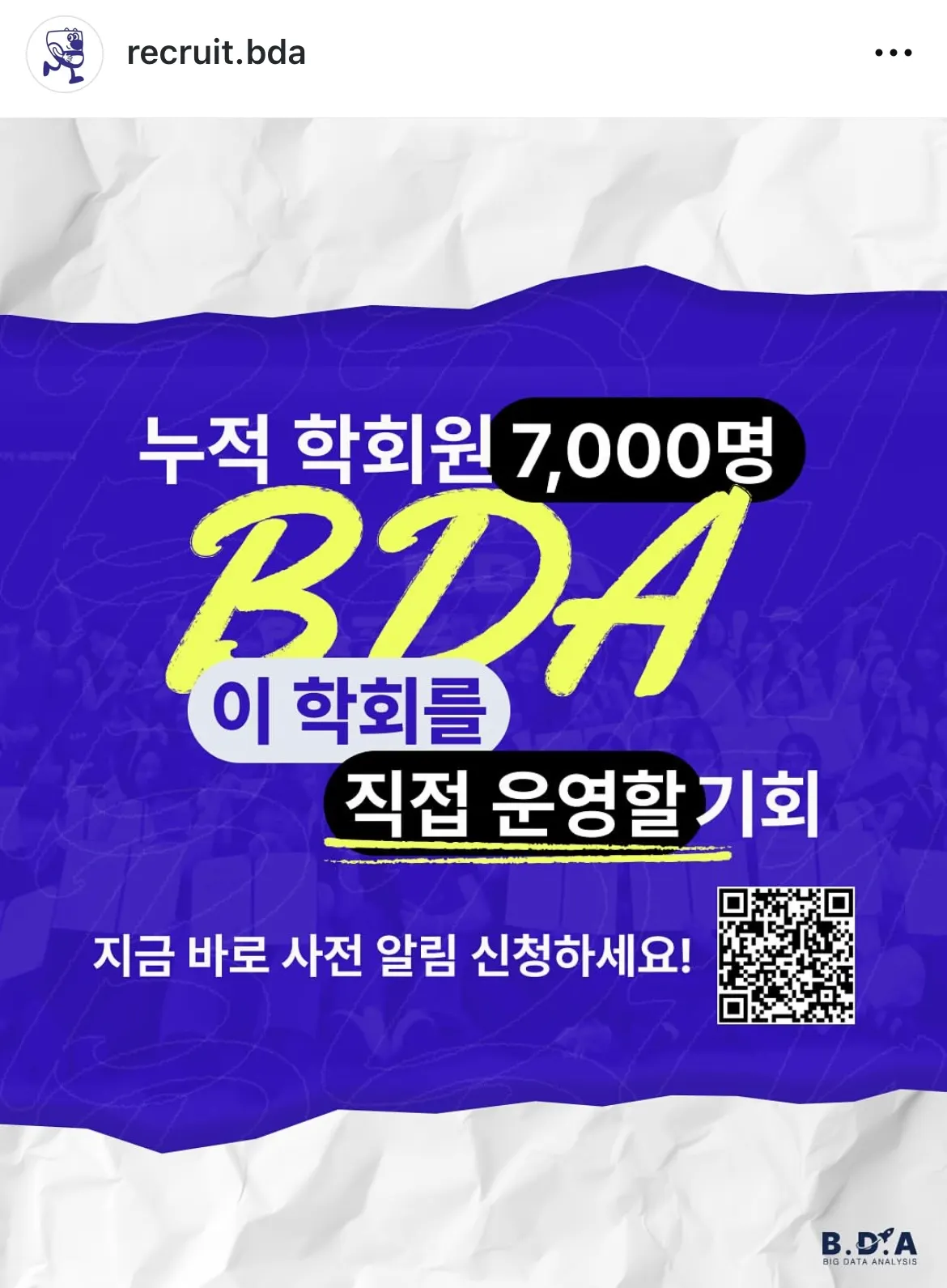 정기 콘텐츠 외에, 채용 시즌에 맞춰 전략적으로 '8기 사전 채용 알람' 콘텐츠를 발행했습니다. 여러 팀과의 협력으로 랜딩 페이지를 제작하여 해당 콘텐츠를 광고 집행하여 채용 알람 신청을 유도했습니다. BDA 운영진이 하는 일을 압축적으로 전달할 수 있는 기획 콘텐츠를 제작하여 잠재 지원자들의 관심을 높였습니다.