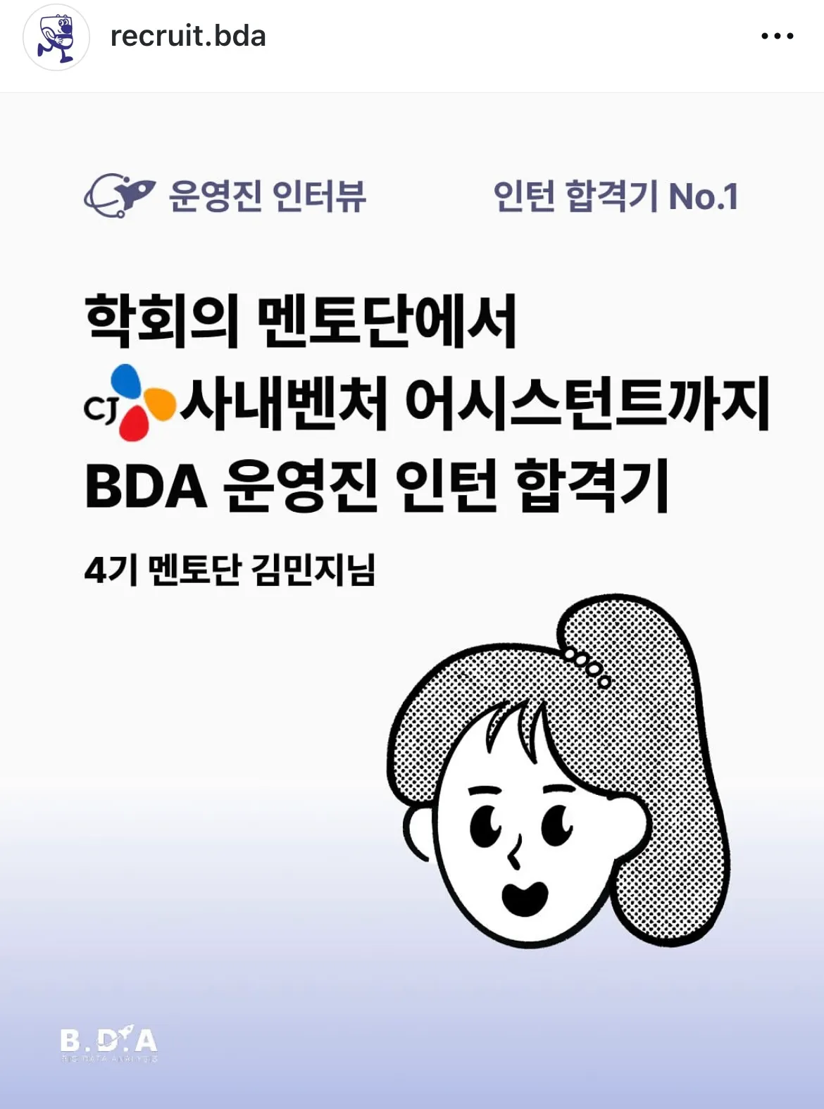 운영진 및 운영진과 협업한 임직원들의 생생한 경험을 공유하는 콘텐츠입니다. BDA 활동 경험 후 채용된 인원 인터뷰, CJ 임직원 직무 인터뷰, 우수 운영진 활동 경험 인터뷰 등을 콘텐츠로 기획하고 제작합니다.