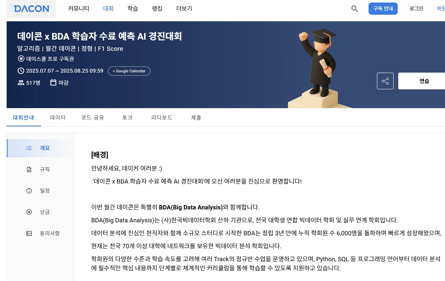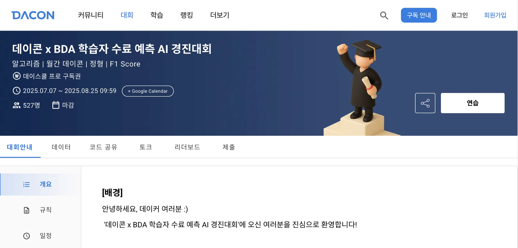 데이콘 경진대회의 성적에 따라 우수학회원 선별 및 수료 여부와 직결되기에 학회원들이 민감하게 반응하는 분야이며, 그렇기에 신속 정확한 일처리가 무엇보다 중요합니다.