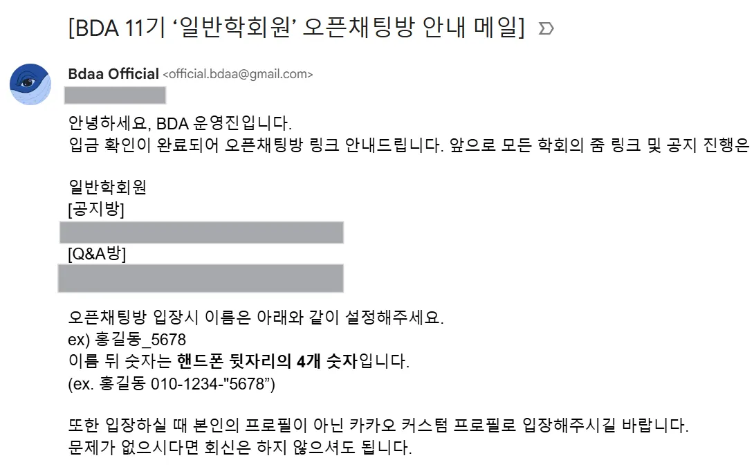 운영관리팀은 실제 모집 기간에 아니더라도 상시적으로 입금 완료 된 신청자를 수합하고 메일을 통해 오픈 채팅방 링크와 노션 페이지를 안내하는 업무를 수행합니다. 오픈 채팅방 Q&A방 또는 공식 메일을 통한 질문이 가장 활발히 들어오는 시기기도 하니 신속한 대처가 필요합니다.
