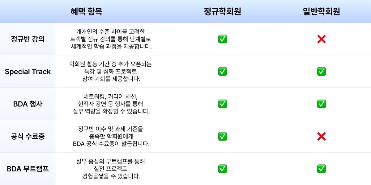 일반학회원은 정규반과정에 참여하지 않지만, BDAI가 제공하는 다양한 학습 콘텐츠와 네트워킹 기회를 자유롭게 선택하여 참여할 수 있습니다.