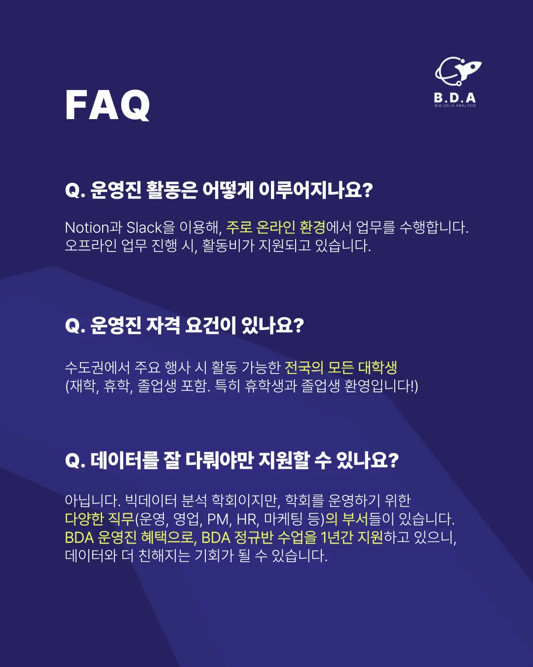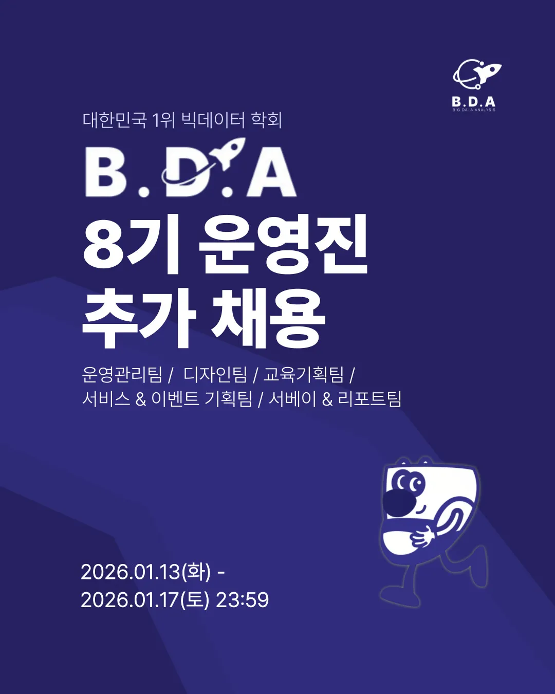 B.D.A는 (사)한국빅데이터학회 산하 기관으로, 전국 대학생 연합 빅데이터 학회 및 실무 연계 학회입니다.