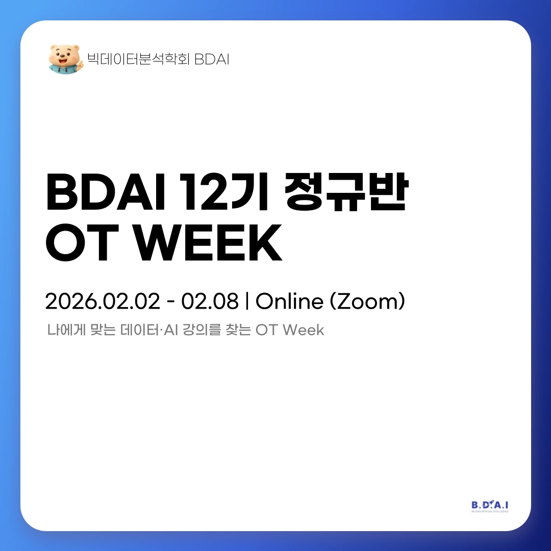 2월 2일(월)부터 2월 8일(일)까지 B.D.A.I 12기 정규반 OT가 진행됩니다.