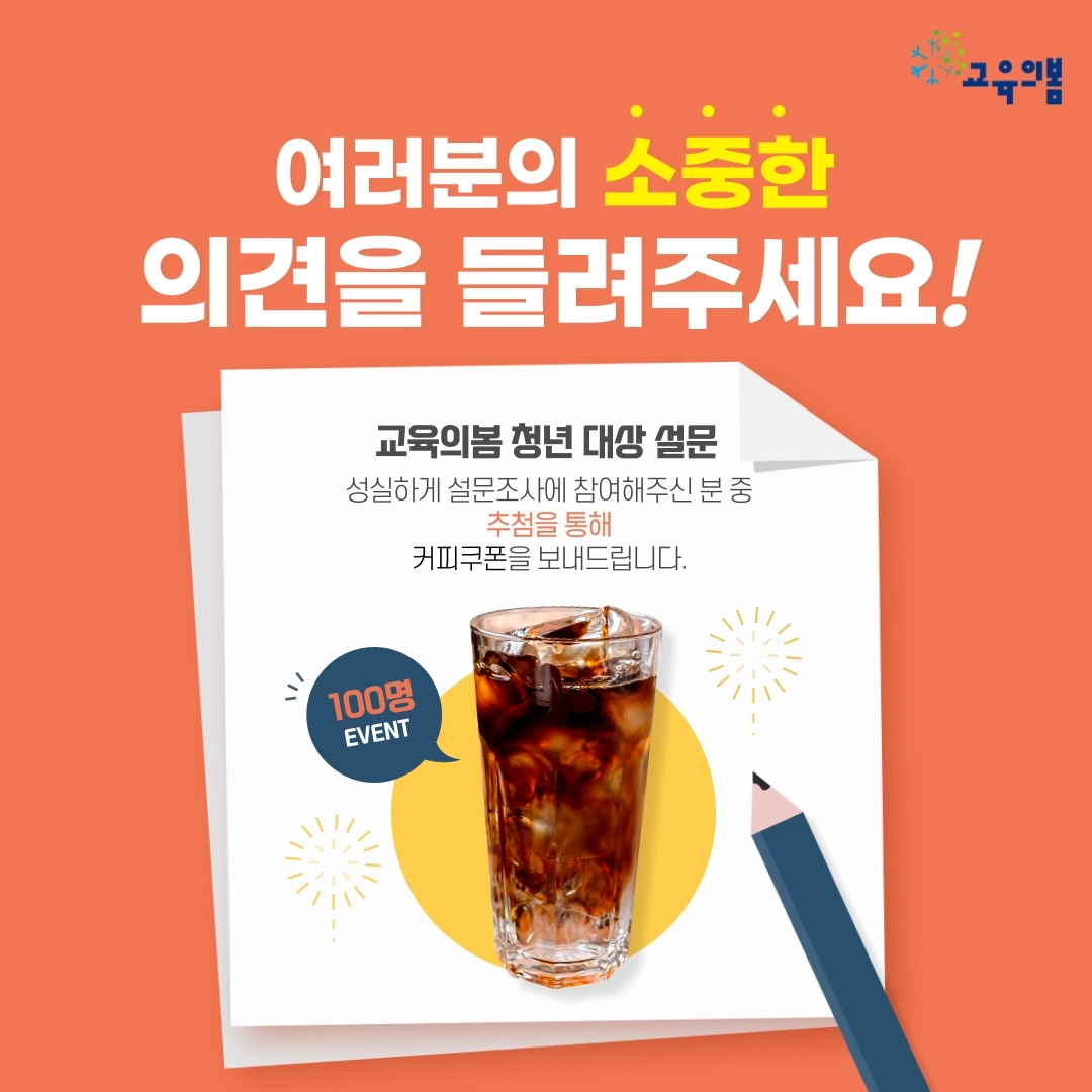 안녕하세요 재단법인 교육의봄입니다. [상세설명은 홈페이지(클릭)를 참고하세요] 저희는 학벌과 출신학교에 의존하지 않는 기업의 역량중심 채용문화를 확산하여 학벌 중심 입시 경쟁과 사교육 고통을 줄이는 활동을 하는 기관입니다. 본 설문은 채용과정에서의 출신학교·학력 차별과 출신학교·학력 채용 차별 방지법에 대한 여러분들의 인식을 알아보고자 진행됩니다. 잠시만 시간을 내어 응답해 주시면 감사하겠습니다. 설문 참여에 대한 감사의 표현으로 100명을 추첨하여 커피쿠폰을 보내 드리겠습니다. 많은 참여 부탁 드립니다. 감사합니다. 🎁 서베이 참여 리워드 - 커피 쿠폰 (100명) - 상점 1점 지급 (정규 학회원 대상) - 서베이 누적 참여(3회/5회/7회) 시 추가 상점 지급 예정 (세부 기준 추후 안내) * 커피쿠폰 발송 : 4/10(금) 예정