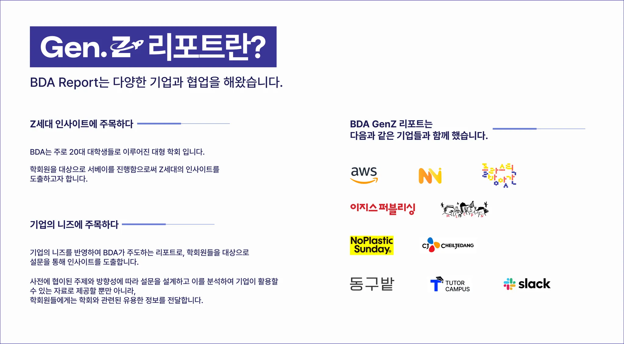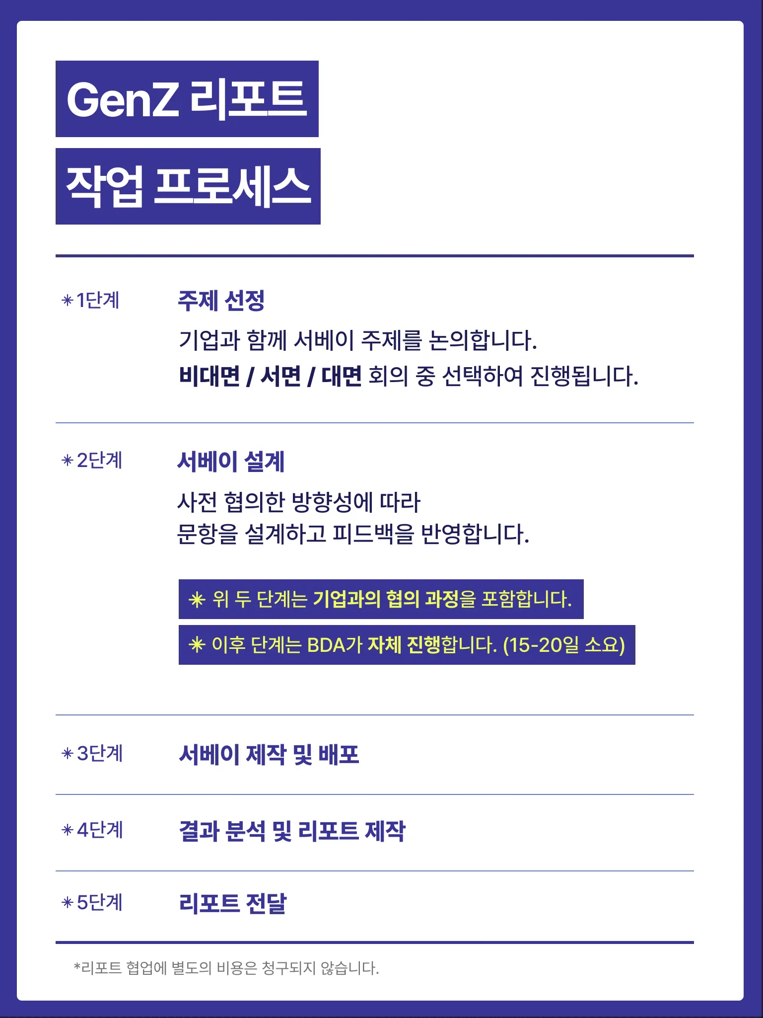 Gen Z 리포트는 기업의 니즈를 반영하여 BDA가 주도하는 리포트로, 학회원들을 대상으로 설문을 통해 인사이트를 도출합니다.
